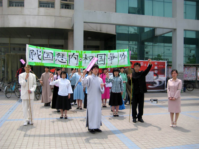 此次活动共分四大部分:一是图文资料展,包括了以“数风流人物”为主题的历史部分和以“看当代青年”为主题的现代部分;二是行为艺术展,包括了五四运动、支教农村、传递圣火和捍卫统一的四个场景复原;三是“爱心募捐”;四是条幅签名部分。活动当天,同学们顶着狂风陆续来到活动地点做好准备工作。天不是很晴朗,同学们的心里却充满了阳光;风不是很温柔,但同学们的胸膛热血满腔。三个小时的站立,保持着一个姿势,同学们没有叫一声苦喊一声累,好多同学从早上七点开始忙,到下午一点都没有吃上哪怕一丁点东西就要继续赶去下午一点的课堂……同学们的精神令到场的南京教育电台和南京日报的记者们都感动不已。现场解说员热情洋溢的解说和同学们高昂的爱国热情感染了在场的每一个人,路过的同学纷纷在爱国宣言横幅上郑重的留下了自己的名字,在募捐箱里留下了自己的一片爱心。