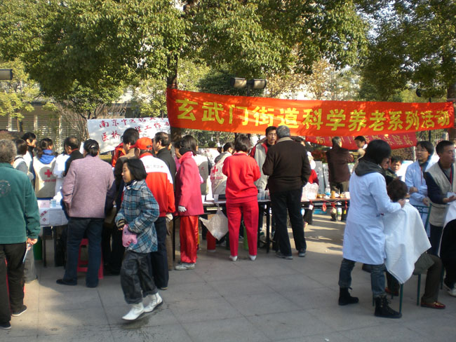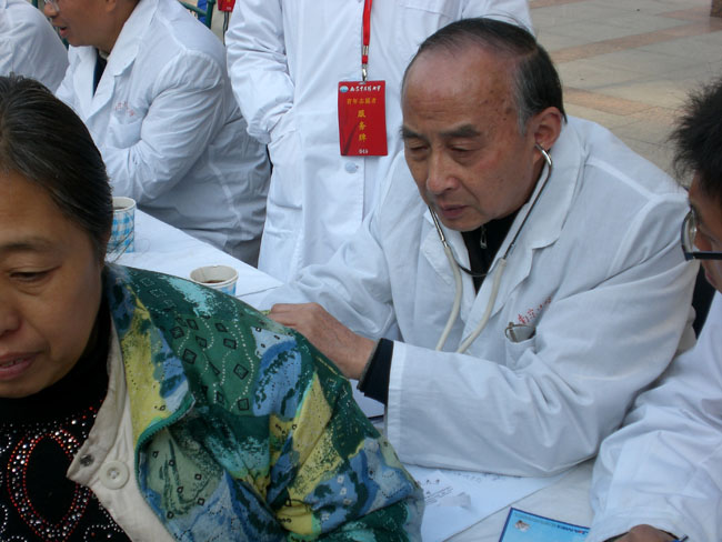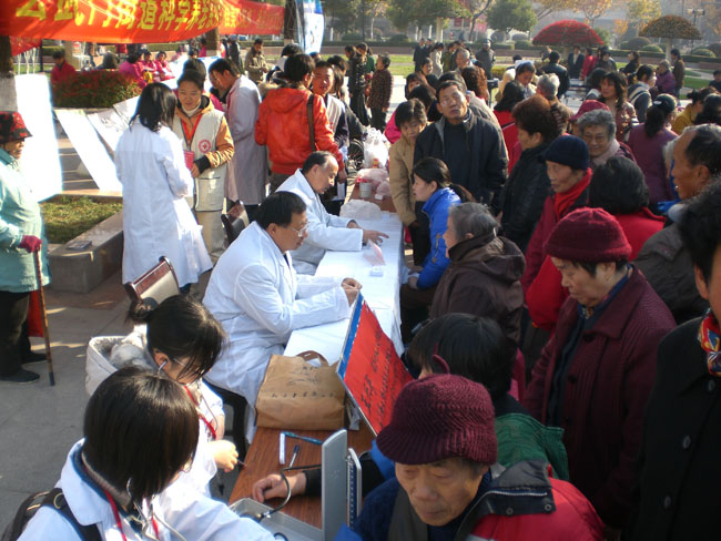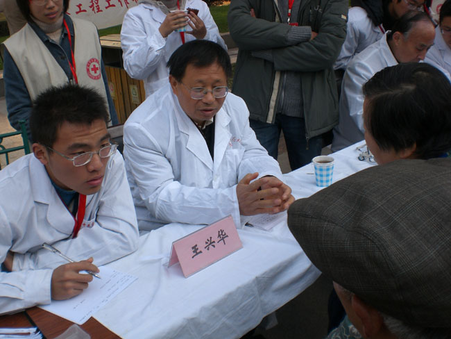 本次义诊由胡烈和王兴华两位著名教授进行现场坐诊,市民们都争相咨询。志愿者们也进行分工合作:有的为老人量血压,并介绍高血压防治和饮食宜忌等方面的知识;有的向市民介绍各种养生保健的药茶、药粥、药酒,并给予品尝;有的为市民推拿服务,得到很好的反响;有的通过展板为市民进行健康宣传;还有的发放有关秋冬养生的宣传材料,并留下“医桥工程”的名片,以便市民有需要可能及时和医桥工程部取得联系。