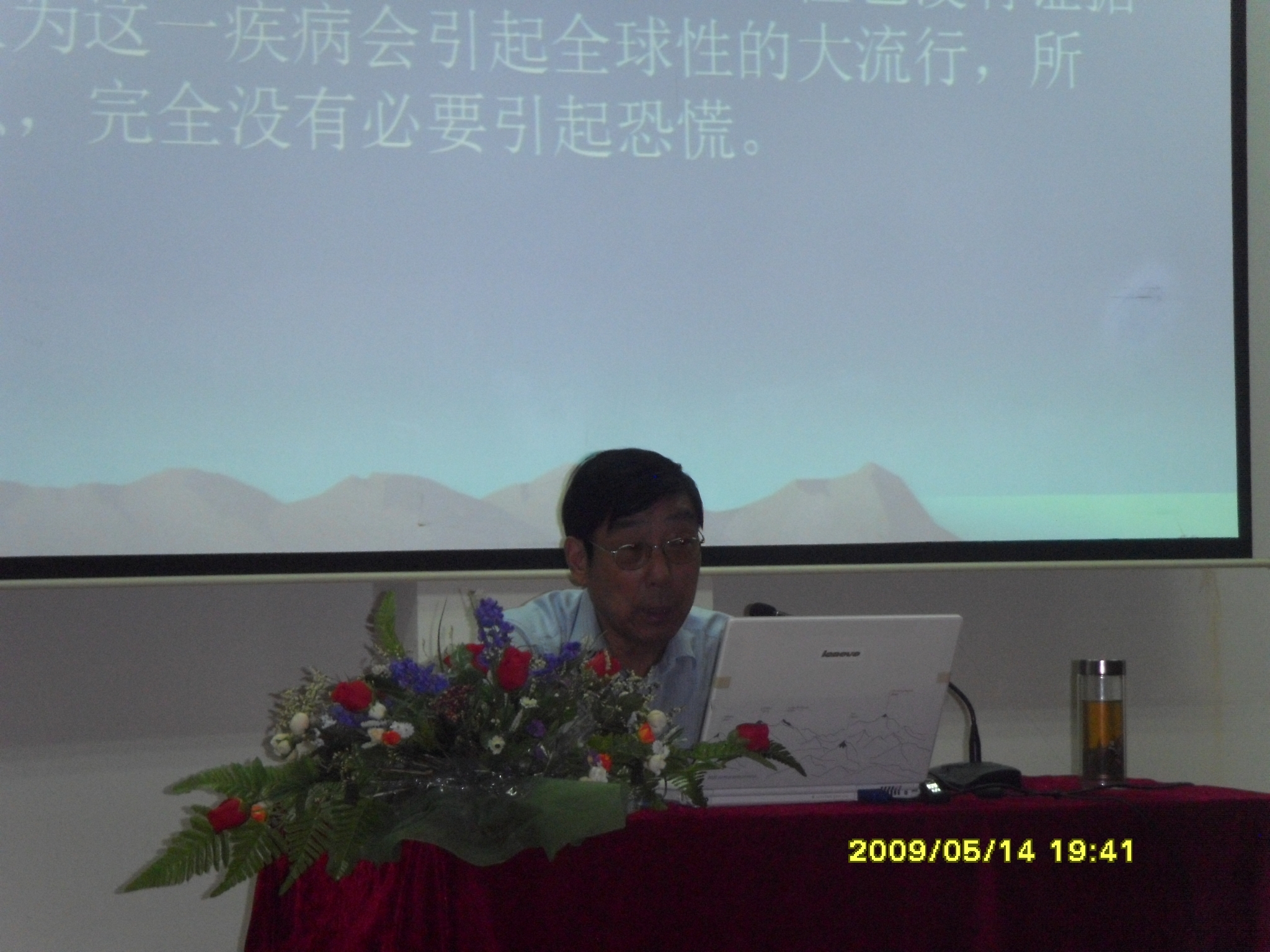 5月14日晚6:30,由校团委主办,大学生科协学术部与07中西医临床(3)班共同承办的学术报告厅之“甲型H1N1流感知识普及”,在我校大学生活动中心107报告厅隆重举行。本次邀请到的是南京中医药大学教授、博士生导师、享受国务院政府特殊津贴专家,现任南京中医药大学基础医学院温病学研究所所长、南京中医药大学国家中医药管理局和江苏省政府中医临床基础重点学科带头人——杨进教授。