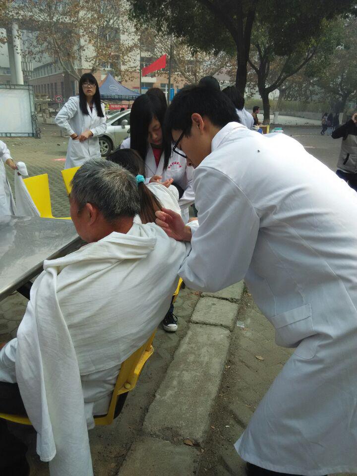 现场气氛热烈,每个参与活动的同学都极其认真而又严肃地对待此次义诊。活动中可见到量血压的同学微微侧头,神情专注;推拿的同学刚柔并济,力度适中;负责药粥药茶的同学也在一旁专注地照看着药锅。各司其职,但明眼看来又是一个整体。白色的身影在校园里形成一道风景线,夺人眼球。
