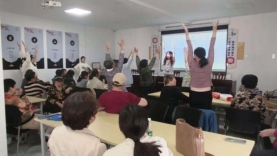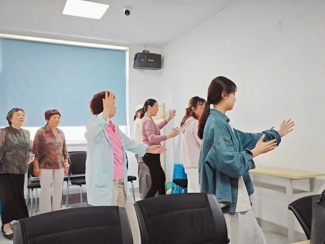 随后,实践团成员介绍了另一项传统养生功法——八段锦,解说其动作分解及健身功效,并进行动作示范,指导老人们进行练习。