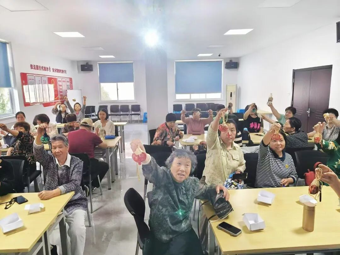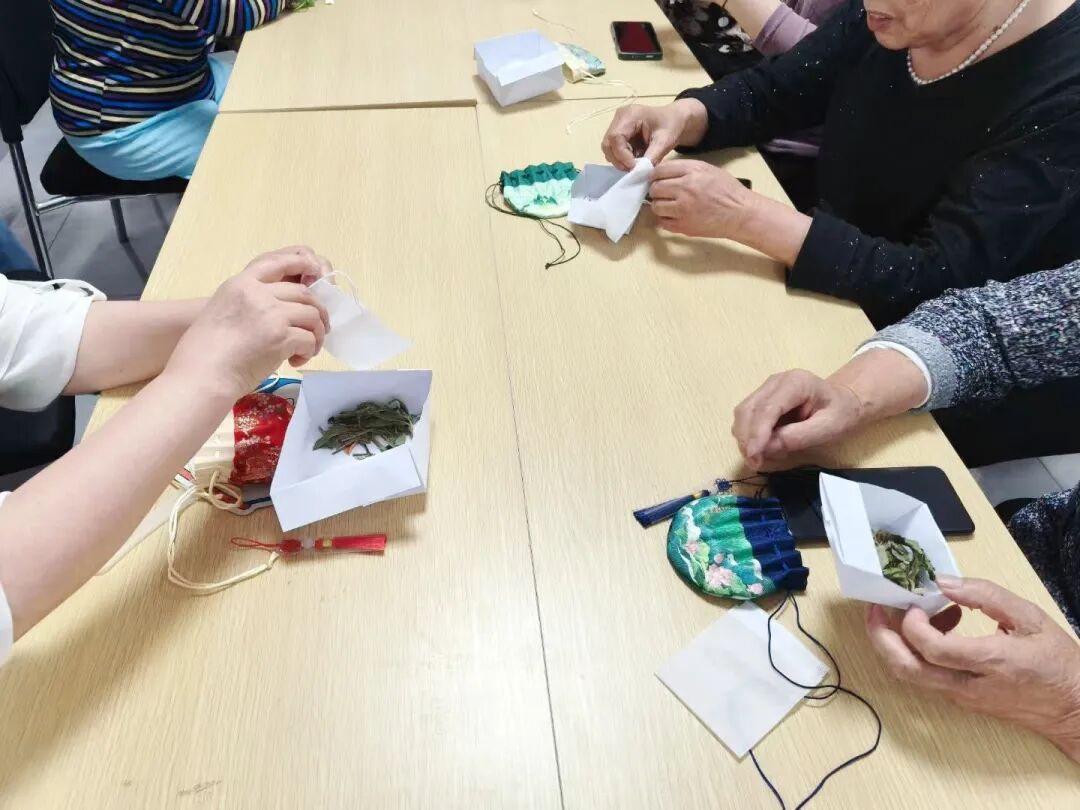 活动结束前,实践团成员与社区老年居民共同展示了制作的香囊及活动学习成果。
